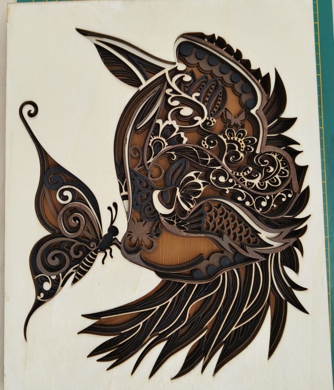 Kocúrik s motýľom. Vyrobené z niekoľkých vrstiev z drevenej preglejky o hrúbke 3 mm. Vhodné ako dekorácia na stenu, darček pre blízku osobu, priateľa. Jednotlivé vrstvy sú farebne upravené tak aby vynikol 3 D efekt.
