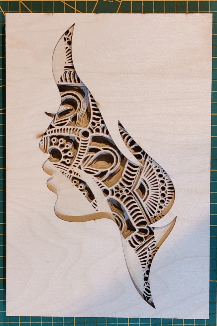 Reliéf tváre ženy. Vyrobené z niekoľkých vrstiev z drevenej preglejky o hrúbke 3 mm. Vhodné ako dekorácia na stenu, darček pre blízku osobu, priateľa. Jednotlivé vrstvy sú farebne upravené tak aby vynikol 3 D efekt.